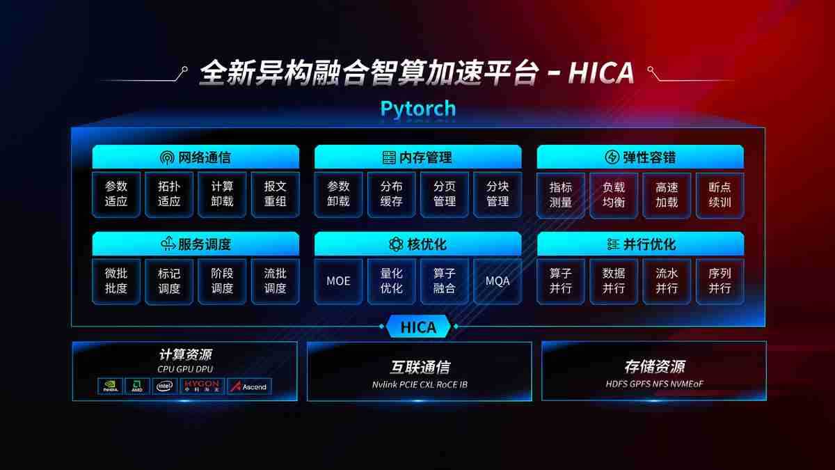 通过自研的服务层、、中间适配层、、以及调度编排算法,,,采用数据并行、、、、模型并行等多种并行方式,,,把并行计算任务进行有效的分解,,,使其分别由相应的软件栈和算力资源来承接。。。当GPU资源变化,,,,HICA可以实时动态调度计算子任务并调整模型拓扑和架构,,,,以充分聚合各种算力资源。。