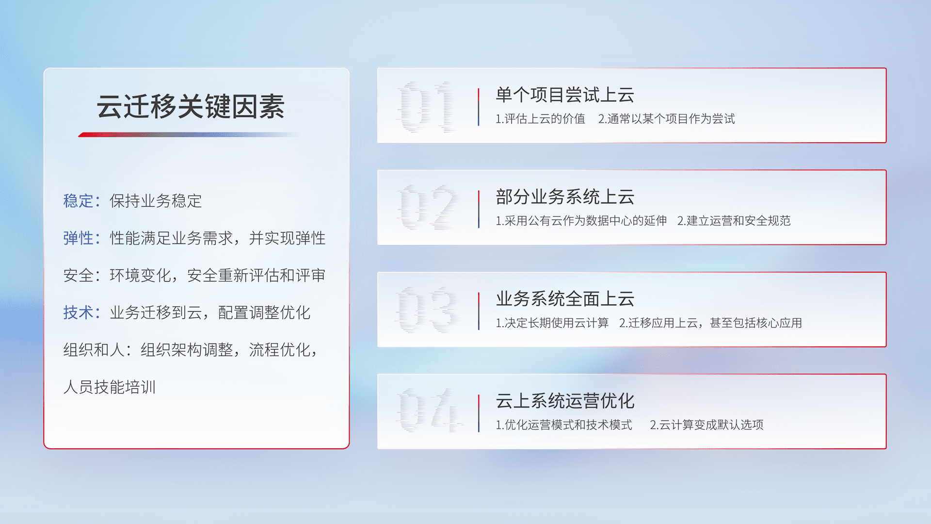 结合实际业务,,,从规划设计、、、、云平台选型、、、、云原生改造、、数据迁移、、、、集成交付,,,迁移全过程为客户识别最佳上云路径,,,做好风险识别管理,,设计网络架构、、、身份权限、、、、安全审计合规、、、、操作审计、、、、日志审计、、、、监控告警策略、、多站点容灾设计等,,,,对云上基础设施进行整体规划,,,,提升IT治理水平,,以满足弹性、、高可用、、高性能的需求。。